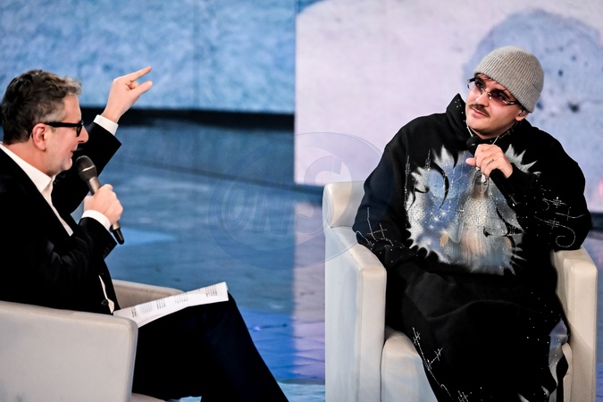 February 1, 2026, Milan. TV show "Che Tempo Che Fa." Geolier, pseudonym of Emanuele Palumbo (Naples, March 23, 2000), Italian rapper. and Fabio Fazio, Credit:Nicola Marfisi / Avalon