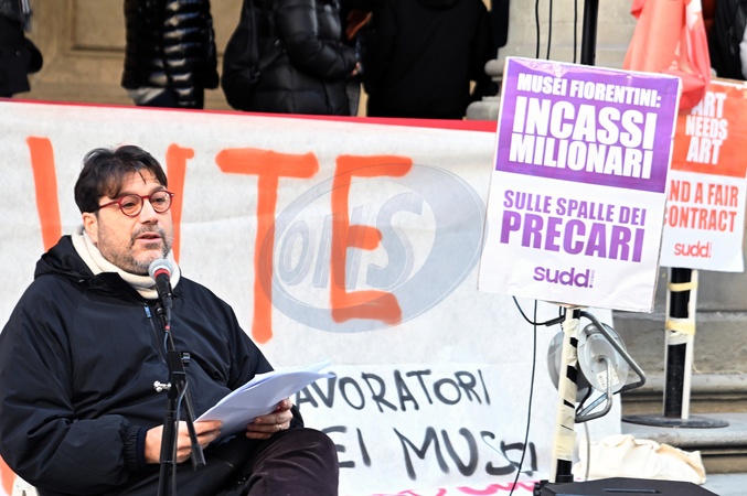 February 1, 2026, Florence. Tomaso Montanari held an open art history lecture in front of the Uffizi Gallery entrance. This initiative was held in support of the Uffizi Gallery's long-time temporary workers, who are now unemployed. The meeting, attended by several hundred people, was organized by SUDD (Union of Democracy and Dignity), COBAS, and Arci Firenze. "Florentine museums: millions of dollars in revenue earned on the backs of temporary workers.", Credit:Aleandro Biagianti / Avalon