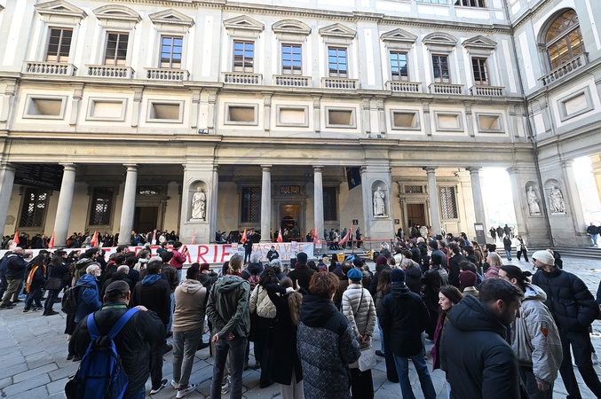 February 1, 2026, Florence. Tomaso Montanari held an open art history lecture in front of the Uffizi Gallery entrance. This initiative was held in support of the Uffizi Gallery's long-time temporary workers who are now unemployed. The event, attended by several hundred people, was organized by SUDD (Union of Democracy and Dignity), COBAS, and Arci Firenze..., Credit:Aleandro Biagianti / Avalon