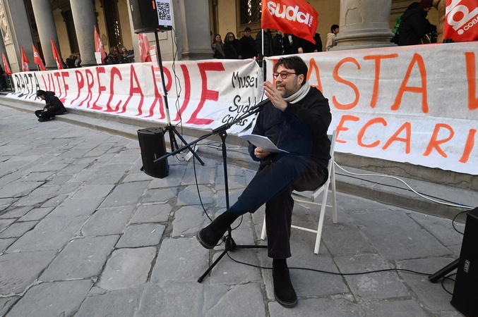 February 1, 2026, Florence. Tomaso Montanari held an open art history lecture in front of the Uffizi Gallery entrance. This initiative was held in support of the Uffizi Gallery's long-time temporary workers who are now unemployed. The event, attended by several hundred people, was organized by SUDD (Union of Democracy and Dignity), COBAS, and Arci Firenze..., Credit:Aleandro Biagianti / Avalon
