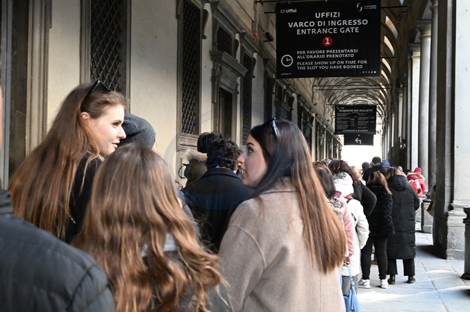 February 1, 2026, Florence. An art historian held an open lecture in front of the Uffizi Gallery entrance. This initiative was held in support of the Uffizi Gallery's long-time temporary workers who are now unemployed. The meeting, attended by several hundred people, was organized by SUDD (Union of Democracy and Dignity), COBAS, and Arci Firenze..., Credit:Aleandro Biagianti / Avalon