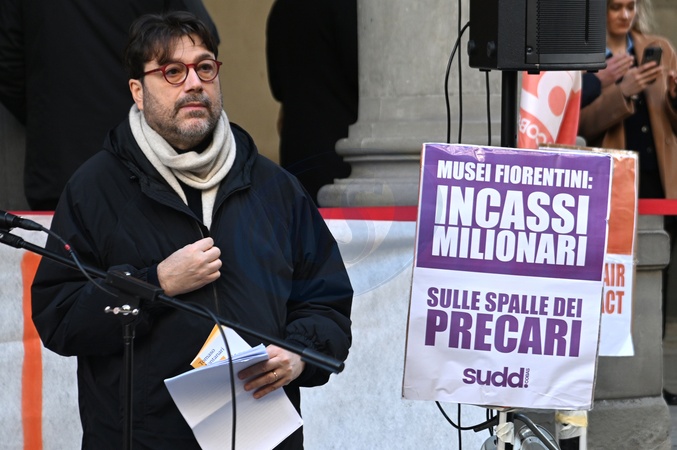 February 1, 2026, Florence. Tomaso Montanari held an open art history lecture in front of the Uffizi Gallery entrance. This initiative was held in support of the Uffizi Gallery's long-time temporary workers, who are now unemployed. The meeting, attended by several hundred people, was organized by SUDD (Union of Democracy and Dignity), COBAS, and Arci Firenze. "Florentine museums: millions of dollars in revenue earned on the backs of temporary workers.", Credit:Aleandro Biagianti / Avalon