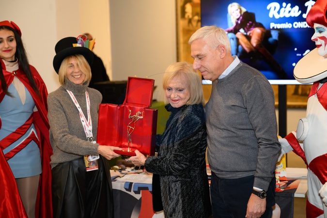 Rita Pavone receives the Ondina D'oro award at the 2026 Viareggio Carnival.