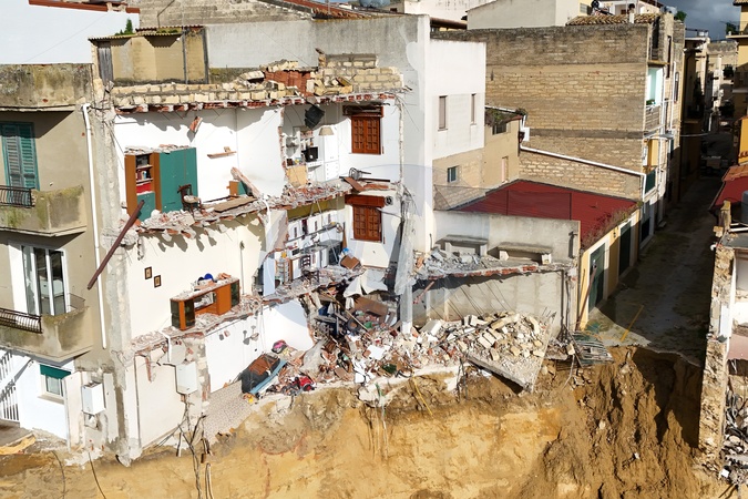 February 2, 2026, Niscemi (Caltanissetta). Another ten meters of erosion in seven days. The landslide advances inland, the collapses continue, and an entire building collapsed two days ago., Credit:FORTUNATE SERRANO' / Avalon