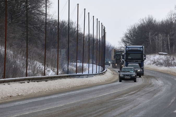 Cars and trucks drive past metal poles installed along the roadside for an anti-drone net, Kharkiv region, February 2, 2026. Large protective nets are being erected around Kharkiv and along key logistics routes in the region to shield transport from Russian FPV drone attacks. As part of systemic security measures, these structures intercept UAVs by forming protective "corridors” over roads in the front-line region., Credit:Viacheslav Madiievskyiv / Avalon