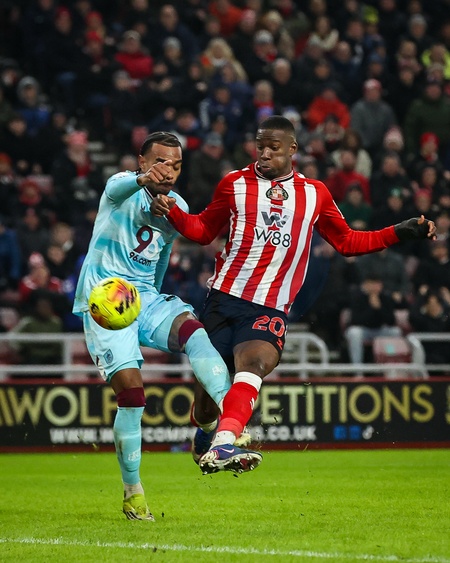 Nordi Mukiele of Sunderland is tackled by Lucas Pires of Burnley during the Premier League match Sunderland vs Burnley at Stadium Of Light, Sunderland, United Kingdom, 2nd February 2026, Credit:Ae Cosgrove/News Images / Avalon
