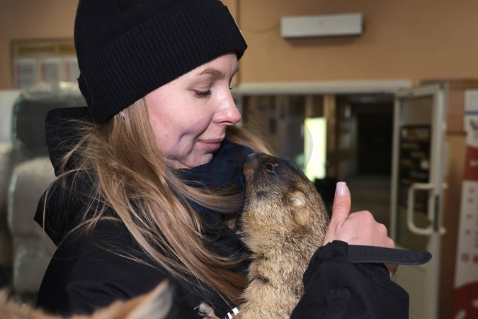 A police officer holds a marmot evacuated with its owners from the Vovchansk district at a transit centre for internally displaced persons in Kharkiv, Ukraine, February 2, 2026. Volunteers and police have evacuated dozens of civilians from the Vovchansk district in northeastern Kharkiv region following an escalation of hostilities., Credit:Viacheslav Madiievskyi / Avalon