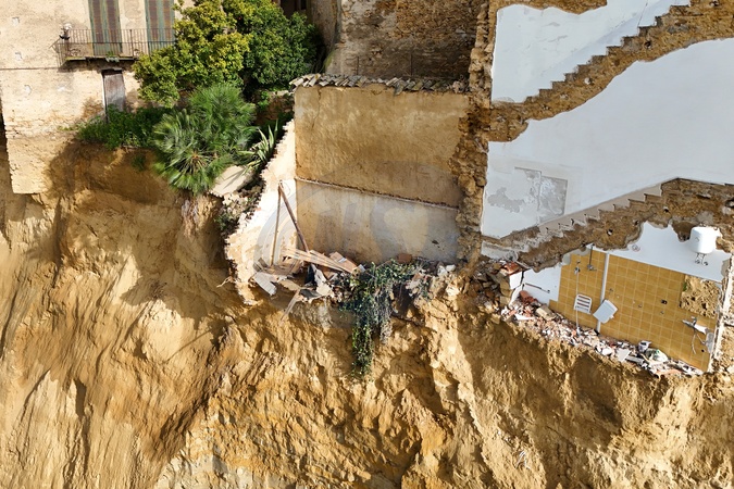 February 3, 2026, Niscemi (CL), Landslide in the town of Niscemi: 1,500 people evacuated and a red zone established. Pictured is the hanging car that fell during the night., Credit:Fortunato Serrano' / Avalon