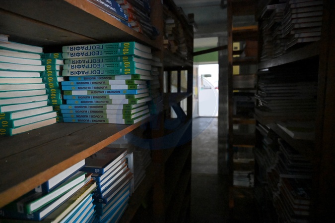 Geography textbooks are stacked on the shelves in the library at Gymnasium No. 126 in Kyiv's Dniprovskyi district, damaged by an overnight Russian drone strike, Kyiv, Ukraine, February 3, 2026. Russia's massive nighttime attack on Kyiv's energy infrastructure left part of the city's left bank without heating. The most difficult situation is in the Darnytskyi and Dniprovskyi districts. Emergency power outages have also been implemented on the left bank., Credit:Yevhen Kotenko / Avalon