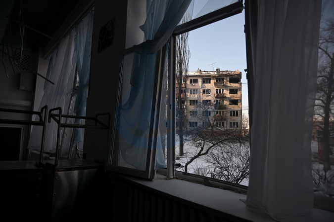 A damaged apartment block is seen through a smashed window at Gymnasium No. 126 in Kyiv's Dniprovskyi district, following an overnight Russian drone strike, Kyiv, Ukraine, February 3, 2026. Russia's massive nighttime attack on Kyiv's energy infrastructure left part of the city's left bank without heating. The most difficult situation is in the Darnytskyi and Dniprovskyi districts. Emergency power outages have also been implemented on the left bank., Credit:Yevhen Kotenko / Avalon