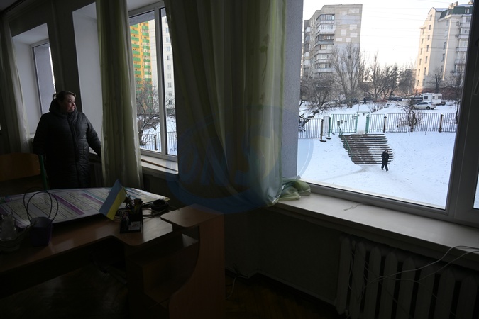 A woman looks out of a window at Gymnasium No. 126 in Kyiv's Dniprovskyi district, damaged by an overnight Russian drone strike, Kyiv, Ukraine, February 3, 2026. Russia's massive nighttime attack on Kyiv's energy infrastructure left part of the city's left bank without heating. The most difficult situation is in the Darnytskyi and Dniprovskyi districts. Emergency power outages have also been implemented on the left bank., Credit:Yevhen Kotenko / Avalon