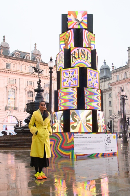 Lakwena Maciver poses with her artwork 'Rise and Shine' in Piccadilly Circus, London, England, UK on Tuesday 3 February, 2026 as part Art of London's Art After Dark, its seasonal art and culture programme., Credit:Justin Ng / Avalon