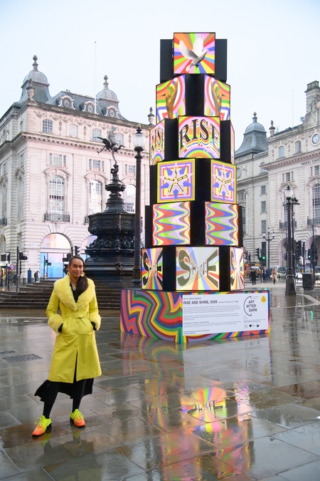 Lakwena Maciver poses with her artwork 'Rise and Shine' in Piccadilly Circus, London, England, UK on Tuesday 3 February, 2026 as part Art of London's Art After Dark, its seasonal art and culture programme., Credit:Justin Ng / Avalon