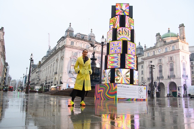 Lakwena Maciver poses with her artwork 'Rise and Shine' in Piccadilly Circus, London, England, UK on Tuesday 3 February, 2026 as part Art of London's Art After Dark, its seasonal art and culture programme., Credit:Justin Ng / Avalon