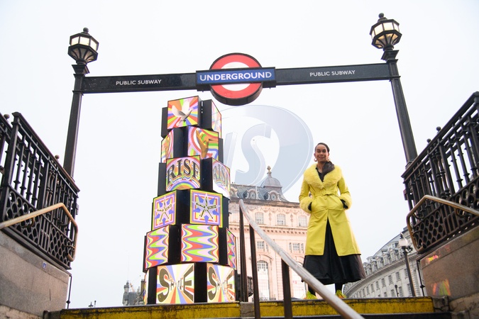 Lakwena Maciver poses with her artwork 'Rise and Shine' in Piccadilly Circus, London, England, UK on Tuesday 3 February, 2026 as part Art of London's Art After Dark, its seasonal art and culture programme., Credit:Justin Ng / Avalon