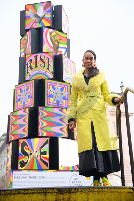 Lakwena Maciver poses with her artwork 'Rise and Shine' in Piccadilly Circus, London, England, UK on Tuesday 3 February, 2026 as part Art of London's Art After Dark, its seasonal art and culture programme., Credit:Justin Ng / Avalon