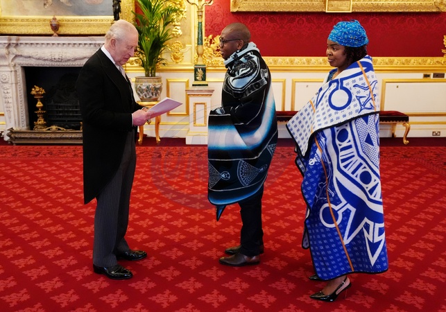 Mosuoe Letuma, High Commissioner of Lesotho, alongside his wife Mrs Makabelo Temana Junior Letuma, presents his credentials during an audience with King Charles III at St James's Palace, London. Picture date: Tuesday February 3, 2026., Credit:Jonathan Brady / Avalon