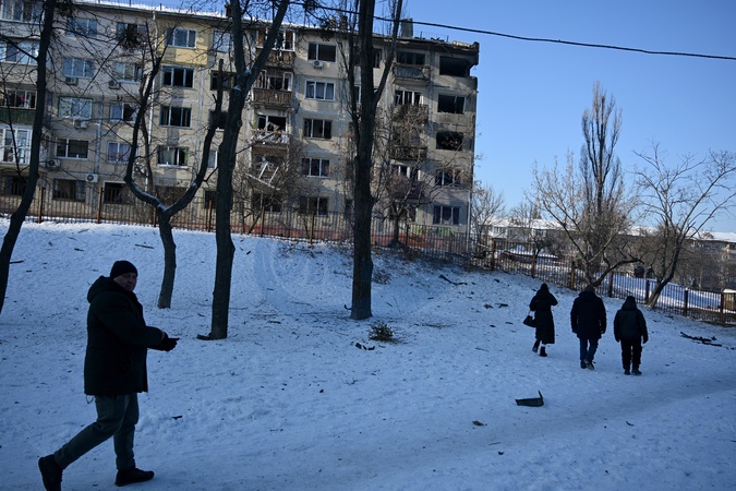 People stay near a five-storey apartment block hit by a Russian drone in the Dniprovskyi district of Kyiv, Ukraine, February 3, 2026. Russia's massive nighttime attack on Kyiv's energy infrastructure left part of the city's left bank without heating. The most difficult situation is in the Darnytskyi and Dniprovskyi districts. Emergency power outages have also been implemented on the left bank., Credit:EVGEN_KOTENKO / Avalon