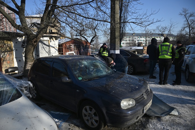 A man removes debris from a car parked near a five-storey apartment block hit by a Russian drone in the Dniprovskyi district of Kyiv, Ukraine, February 3, 2026. Russia's massive nighttime attack on Kyiv's energy infrastructure left part of the city's left bank without heating. The most difficult situation is in the Darnytskyi and Dniprovskyi districts. Emergency power outages have also been implemented on the left bank., Credit:EVGEN_KOTENKO / Avalon