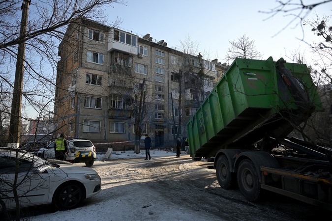 A construction waste container delivered by municipal workers is being installed near an apartment block hit by a Russian drone in the Dniprovskyi district of Kyiv, Ukraine, February 3, 2026. Russia's massive nighttime attack on Kyiv's energy infrastructure left part of the city's left bank without heating. The most difficult situation is in the Darnytskyi and Dniprovskyi districts. Emergency power outages have also been implemented on the left bank., Credit:EVGEN_KOTENKO / Avalon