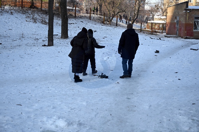 People look at the fragments found after a Russian drone hit a five-storey apartment block in the Dniprovskyi district of Kyiv, Ukraine, February 3, 2026. Russia's massive nighttime attack on Kyiv's energy infrastructure left part of the city's left bank without heating. The most difficult situation is in the Darnytskyi and Dniprovskyi districts. Emergency power outages have also been implemented on the left bank., Credit:EVGEN_KOTENKO / Avalon