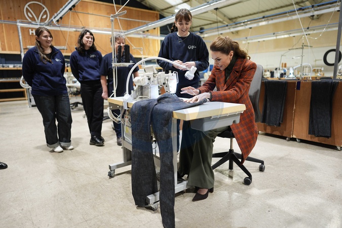 The Princess of Wales sews a 'Made in Wales' tag onto a pair of jeans during a visit to Hiut Denim, a family-owned company based in Cardigan, designing and manufacturing premium jeans entirely in the UK. Hiut was founded in 2011 to bring the knowledge and skill of jean-making back to Cardigan, where production began in the 1960s. Picture date: Tuesday February 3, 2026., Credit:Aaron Chown / Avalon