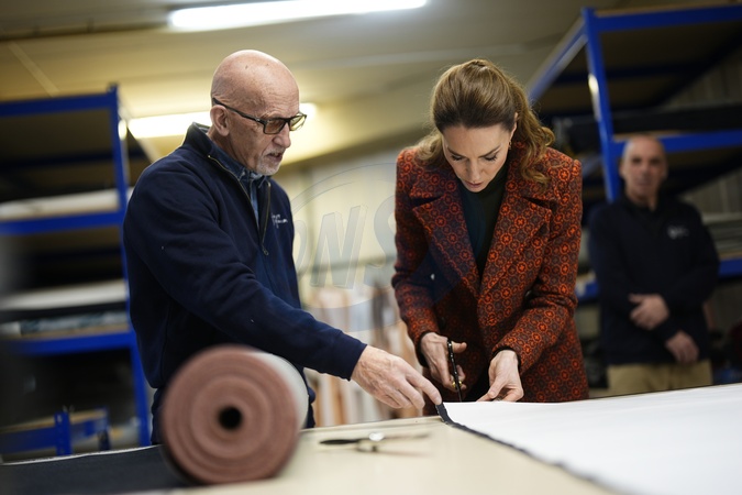 The Princess of Wales has a go at cutting material during a visit to Hiut Denim, a family-owned company based in Cardigan, designing and manufacturing premium jeans entirely in the UK. Hiut was founded in 2011 to bring the knowledge and skill of jean-making back to Cardigan, where production began in the 1960s. Picture date: Tuesday February 3, 2026., Credit:Aaron Chown / Avalon