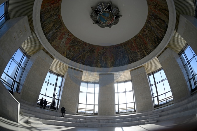 Specialists measure windows for replacement of panes shattered as a result of Russian shelling in the Hall of Fame of the National Museum of the History of Ukraine in the Second World War beneath the Motherland Monument, Kyiv, Ukraine, on February 3, 2026, Credit:Yevhen Kotenko / Avalon
