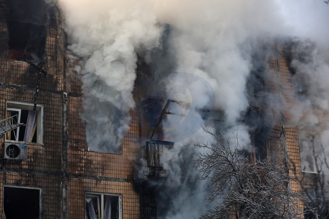 Smoke rises from a five-story residential building struck by a Russian drone in a residential area of Kharkiv, Ukraine, on February 3, 2026, Credit:Viacheslav Madiievskyi / Avalon