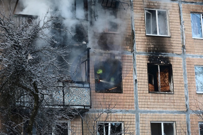 A SES firefighter puts out a fire in an apartment of a five-story residential building struck by a Russian UAV, Kharkiv, Ukraine, on February 3, 2026, Credit:Viacheslav Madiievskyi / Avalon