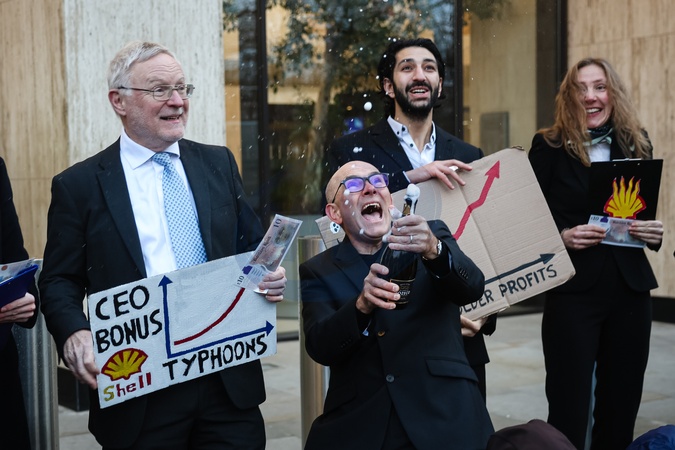 Activists dressed as shareholders stage a mock ‘profits party' outside Shell's headquarters in London, UK, on 04 February 2026, while other protesters display images of climate devastation during a demonstration timed with the company's annual profits announcement., Credit:Pete Speller / Avalon