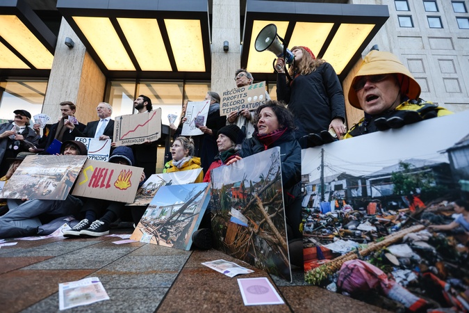 Activists dressed as shareholders stage a mock ‘profits party' outside Shell's headquarters in London, UK, on 04 February 2026, while other protesters display images of climate devastation during a demonstration timed with the company's annual profits announcement., Credit:Pete Speller / Avalon