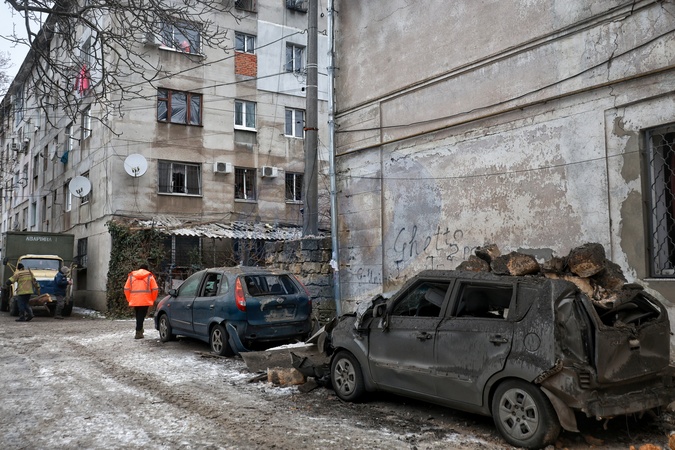 Crushed cars are outside a two-storey apartment block damaged by a Russian drone attack, Odesa, Ukraine, February 4, 2026. Five people were injured in the overnight strike on the southern port city, which also damaged residential buildings as well as civil and industrial infrastructure., Credit:Nina Liashonok / Avalon