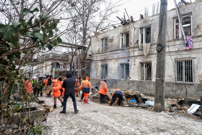 Municipal workers participate in a response effort at a two-storey apartment block damaged by a Russian drone attack, Odesa, Ukraine, February 4, 2026. Five people were injured in the overnight strike on the southern port city, which also damaged residential buildings as well as civil and industrial infrastructure., Credit:Nina Liashonok / Avalon
