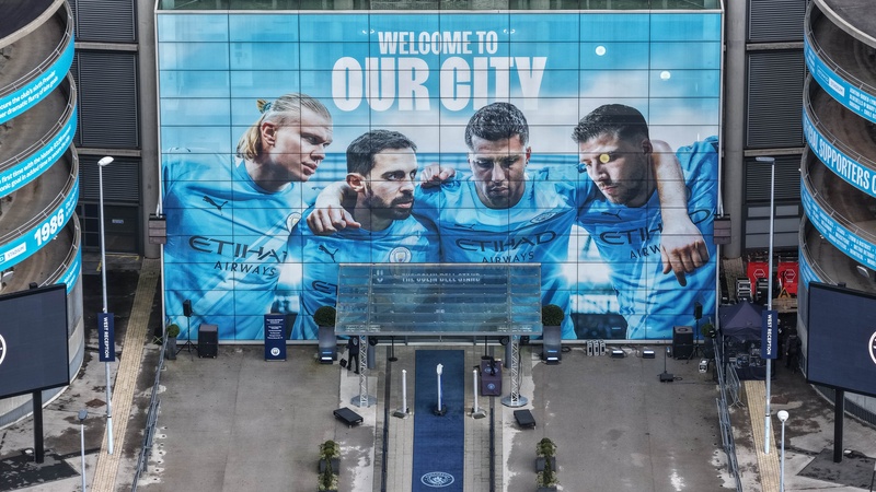 The players entrance with Welcome to our City mural of Erling Haaland, Bernardo Silva, Rodrigo and Ruben Dias of Manchester City during the Carabao Cup Semi-Final second leg match Manchester City vs Newcastle United at Etihad Stadium, Manchester, United Kingdom, 4th February 2026, Credit:Mark Cosgrove/News Images / Avalon