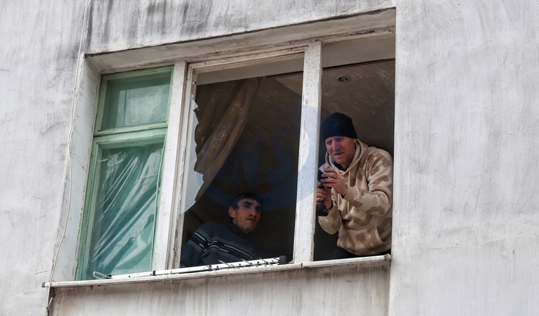 Two men repair a window in a two-storey apartment block shattered by a Russian drone attack, Odesa, Ukraine, February 4, 2026. Five people were injured in the overnight strike on the southern port city, which also damaged residential buildings as well as civil and industrial infrastructure., Credit:Nina Liashonok / Avalon