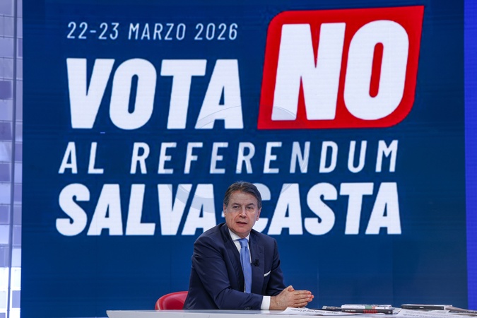 February 4, 2026, Rome, La7, TV show L'Aria che Tira, photo by Giuseppe Conte, behind the sign "Vote no to the referendum to save the caste.", Credit:Cristiano Minichiello / Avalon