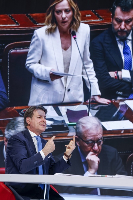 February 4, 2026, Rome, La7, TV show L'Aria che Tira, pictured: Giuseppe Conte, behind a photo of Giorgia Meloni, Matteo Salvini, Credit:Cristiano Minichiello / Avalon