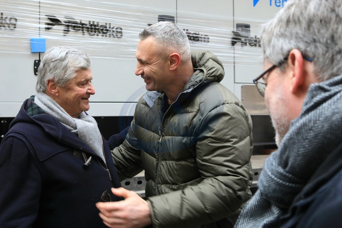 Minister Delegate to France's Minister for Europe and Foreign Affairs for Foreign Trade and Attractiveness Nicolas Forissier, Kyiv city head Vitali Klitschko and Ambassador Extraordinary and Plenipotentiary of the French Republic to Ukraine Gael Veyssiere (L to R) participate in the handover of the first 30 generators from the Crisis and Support Centre of the French Ministry for Europe and Foreign Affairs to the Kyivteploenerho Communal Enterprise, a heating and electricity provider supplying centralized heating and hot water to residents and businesses of Kyiv, under the EU Civil Protection Mechanism, Kyiv, Ukraine, February 4, 2026., Credit:Volodymyr Tarasov / Avalon