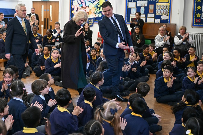 Britain's Queen Camilla (C) arrives to attend a talk by British children's author Chris Smith (not pictured) as she attends the opening of a library at Christ Church Primary School in London on February 4, 2026, to help mark the "National Year of Reading"., Credit:JUSTIN TALLIS / Avalon