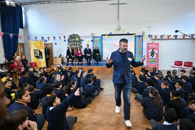 Britain's Queen Camilla (at R-seated on stage) listens to British children's author Chris Smith (R) speak to pupils as she attends the opening of a library at Christ Church Primary School in London on February 4, 2026, to help mark the "National Year of Reading"., Credit:JUSTIN TALLIS / Avalon