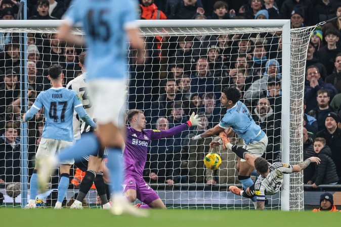 Omar Marmoush of Manchester City scores to make it 2-0 during the Carabao Cup Semi-Final second leg match Manchester City vs Newcastle United at Etihad Stadium, Manchester, United Kingdom, 4th February 2026, Credit:Mark Cosgrove/News Images / Avalon