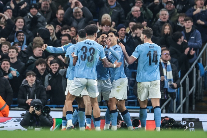 Omar Marmoush of Manchester City celebrates his goal to make it 2-0 during the Carabao Cup Semi-Final second leg match Manchester City vs Newcastle United at Etihad Stadium, Manchester, United Kingdom, 4th February 2026, Credit:Mark Cosgrove/News Images / Avalon