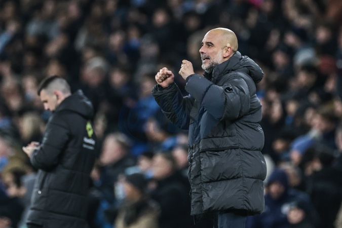 Pep Guardiola manager of Manchester City celebrates a goal from Tijjani Reijnders of Manchester City making it 3-0 during the Carabao Cup Semi-Final second leg match Manchester City vs Newcastle United at Etihad Stadium, Manchester, United Kingdom, 4th February 2026, Credit:Mark Cosgrove/News Images / Avalon