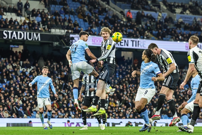 Nick Woltemade of Newcastle United heads on goal during the Carabao Cup Semi-Final second leg match Manchester City vs Newcastle United at Etihad Stadium, Manchester, United Kingdom, 4th February 2026, Credit:Mark Cosgrove/News Images / Avalon