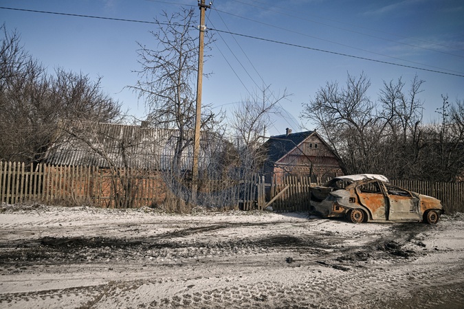 A burnt-out car destroyed by Russian shelling is left at a fence near houses in front-line Yurkivka village, Zaporizhzhia region, Ukraine, February 3, 2026., Credit:Dmytro Smolienko / Avalon