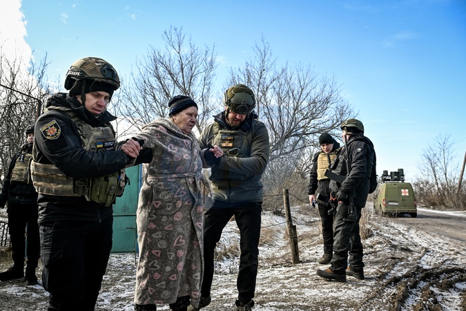 A police officer and a volunteer help an elderly woman reach a vehicle during the evacuation from front-line Tavriiske village, Zaporizhzhia region, Ukraine, February 3, 2026., Credit:Dmytro Smolienko / Avalon
