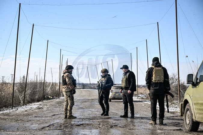 Police officers stand in the middle of a road shielded by an anti-drone net against Russian FPV drones during the evacuation of residents from front-line Tavriiske and Yurkivka villages, Zaporizhzhia region, Ukraine, February 3, 2026., Credit:Dmytro Smolienko / Avalon