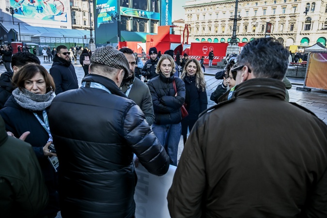 February 5, 2026, Milan. Piazza Duomo. PETA's protest before the Olympics, "Better Naked Than Wear Feathers," is underway. A trio of nearly naked PETA supporters—wearing only hats, ski goggles, and snow boots—stand behind a banner reading "We'd Rather Go Naked Than Wear Feathers!" Police checks after the protest., Credit:Nicola Marfisi / Avalon