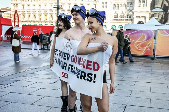 PETA protests "We'd Rather go naked than wear feathers!" before the Olympics.